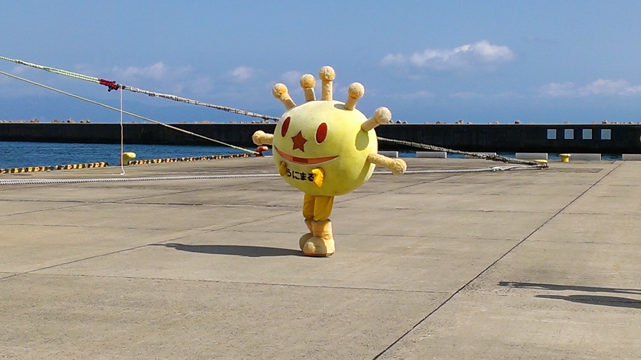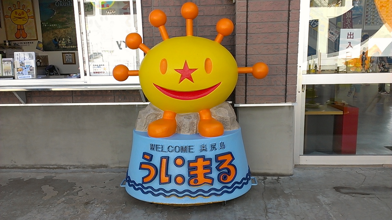 奥尻到着。ゆるキャラのうにまるくんが歓迎してました。