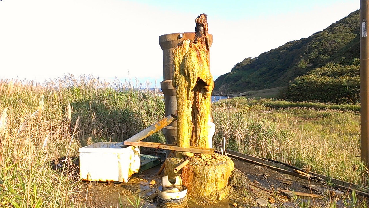 天然温泉の神威脇温泉。車で少し離れた場所に温泉源らしきものを発見。